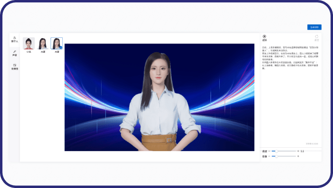 无需繁琐拍摄,无需花费上万元请模特。这里有多个专业演员拍成的数字人,您只需敲敲键盘,就能按您的文稿来说话